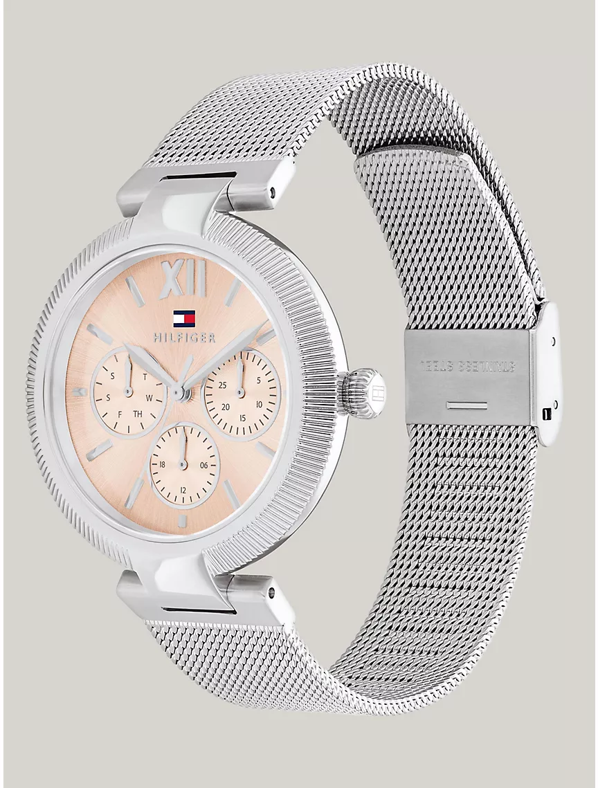 - 36mm stainless steel case with fluted bezel, blush dial, stainless steel mesh T-bar integrated bracelet, multifunction movement, sub-dials.